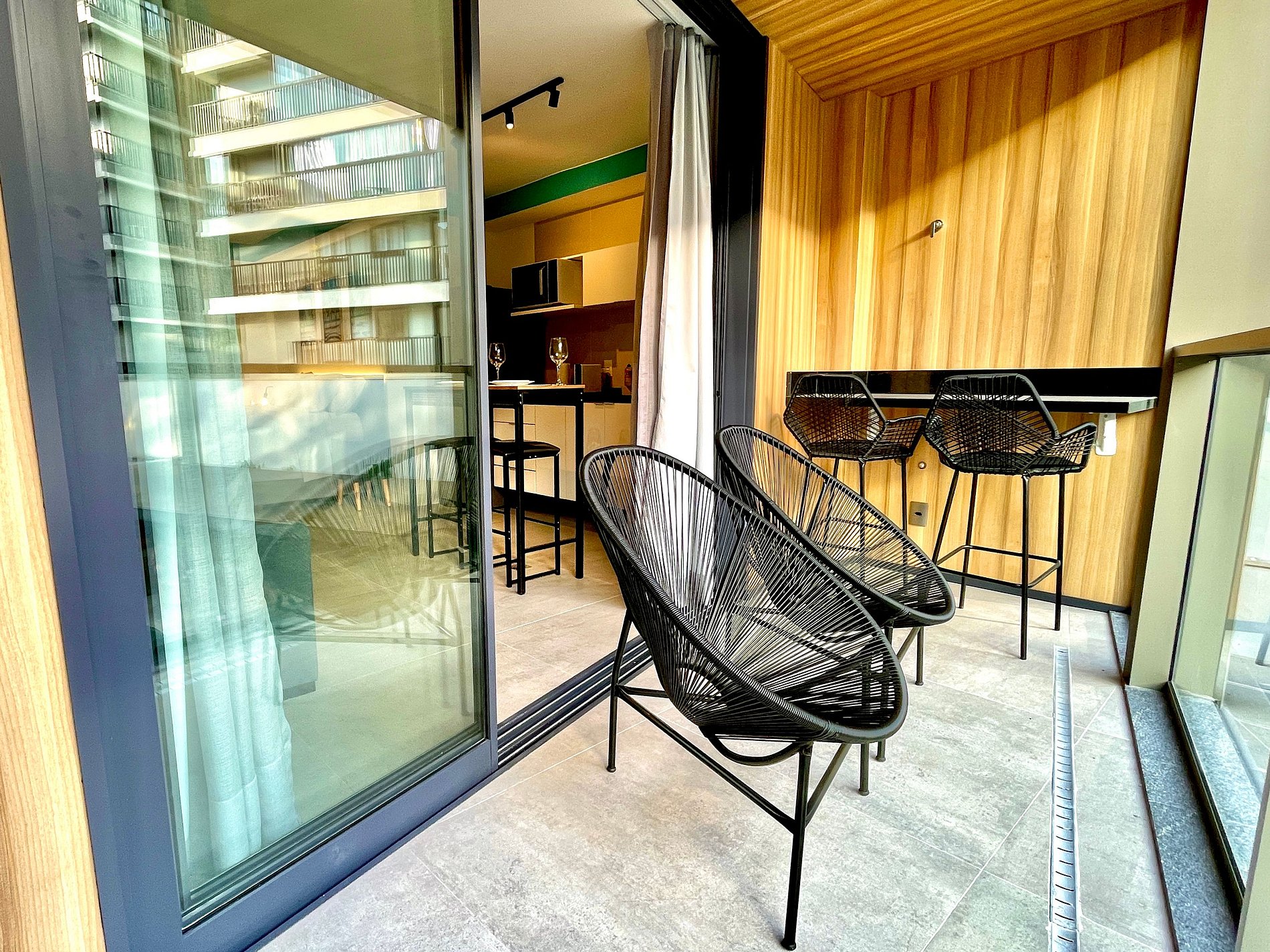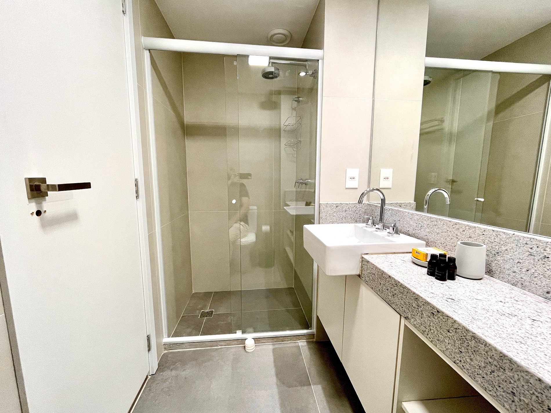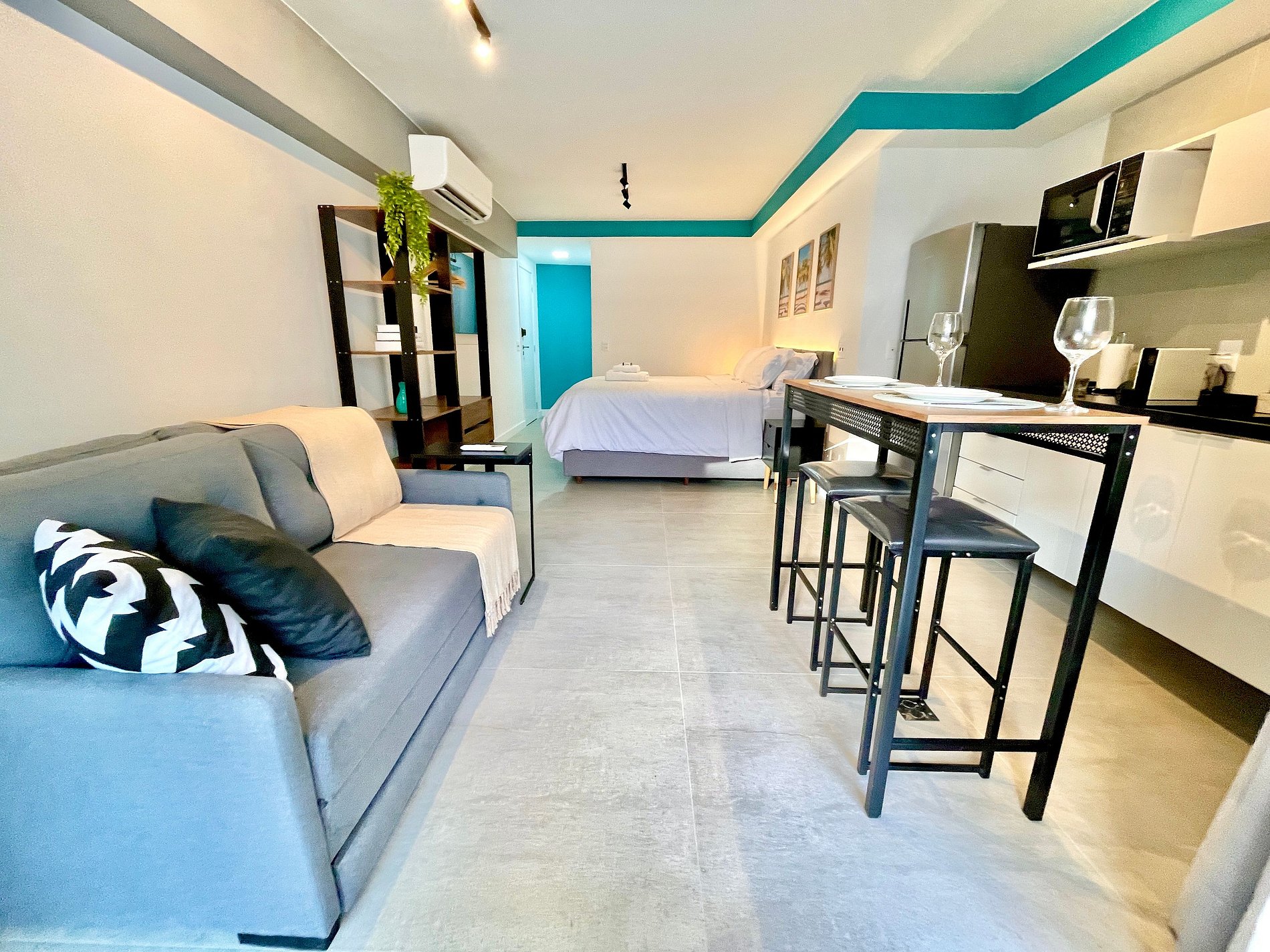 Quarto/sala super agradável com sofá cama, cama queen, armários, ar condicionado, Smart TV, cortina blackout, mesa de jantar, diversas tomadas, além de contar com uma varanda super charmosa. Internet de alta velocidade. Banheiro todo completo e com chuveiro com boa pressão. Cozinha equipada com geladeira, cooktop, microondas, máquina de Nespresso e diversos utensílios. Oferece também outras comodidades, como berço portátil*, secador de cabelo, tábua e ferro de passar roupa e kit de amenities (shampoo, condicionador e sabonete).