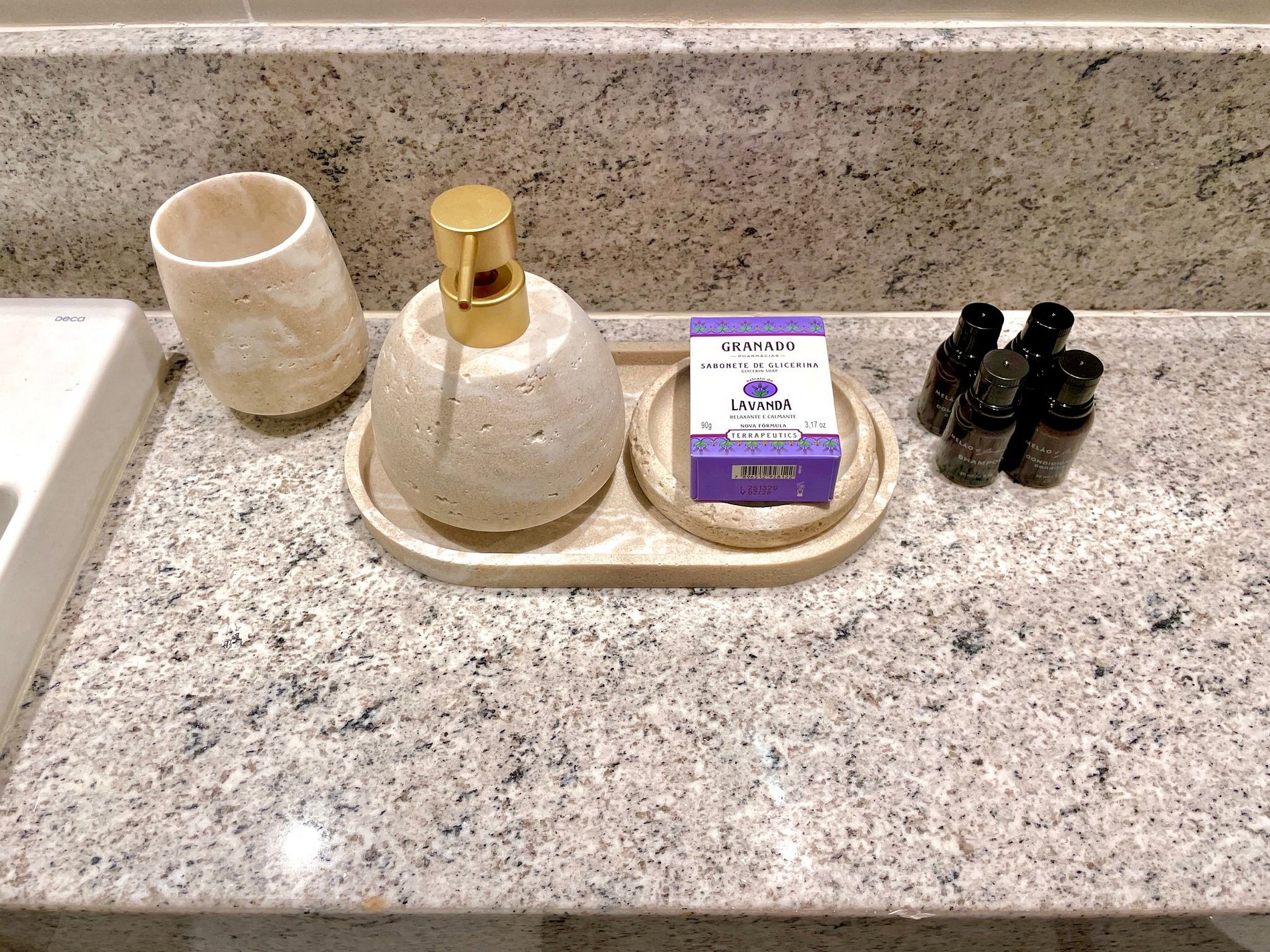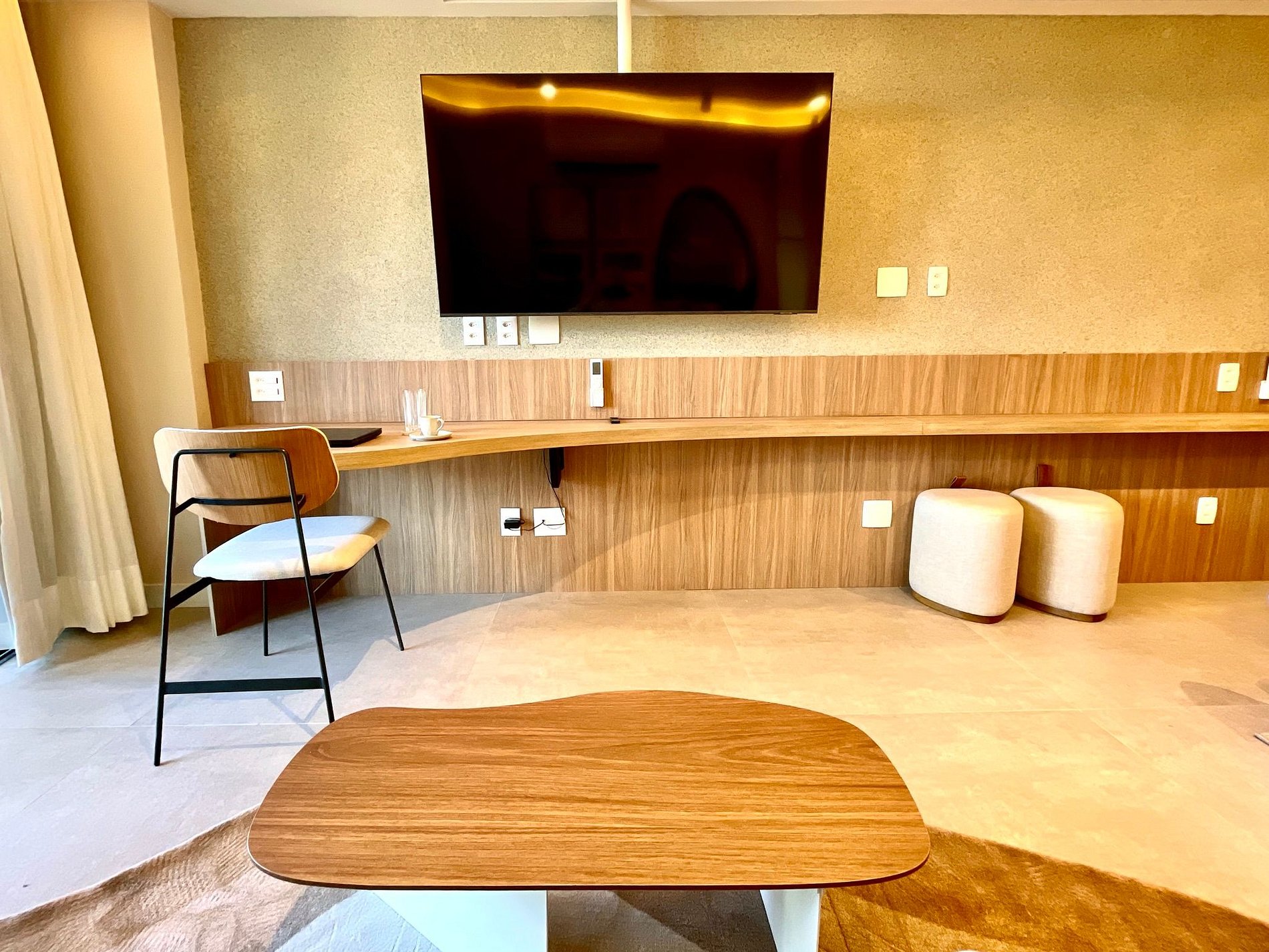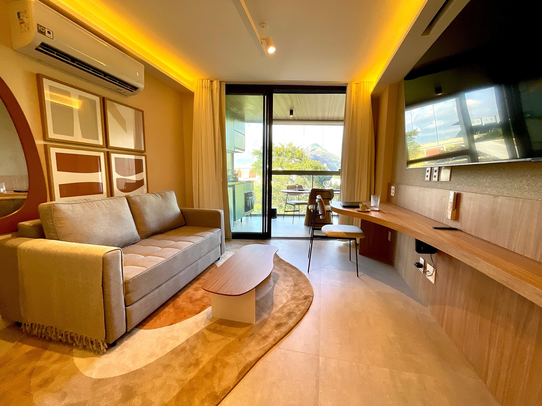 Quarto/sala super agradável com sofá cama, cama queen, armários, ar condicionado, Smart TV, cortina blackout, mesa de jantar, diversas tomadas, além de contar com uma varanda super charmosa. Internet de alta velocidade. Banheiro todo completo e com chuveiro com boa pressão. Cozinha equipada com geladeira, cooktop, forno, máquina de Nespresso, Airfryer, filtro de água e diversos utensílios. Oferece também outras comodidades, como berço portátil, secador de cabelo, tábua e ferro de passar roupa e kit de amenities (shampoo, condicionador e sabonete).