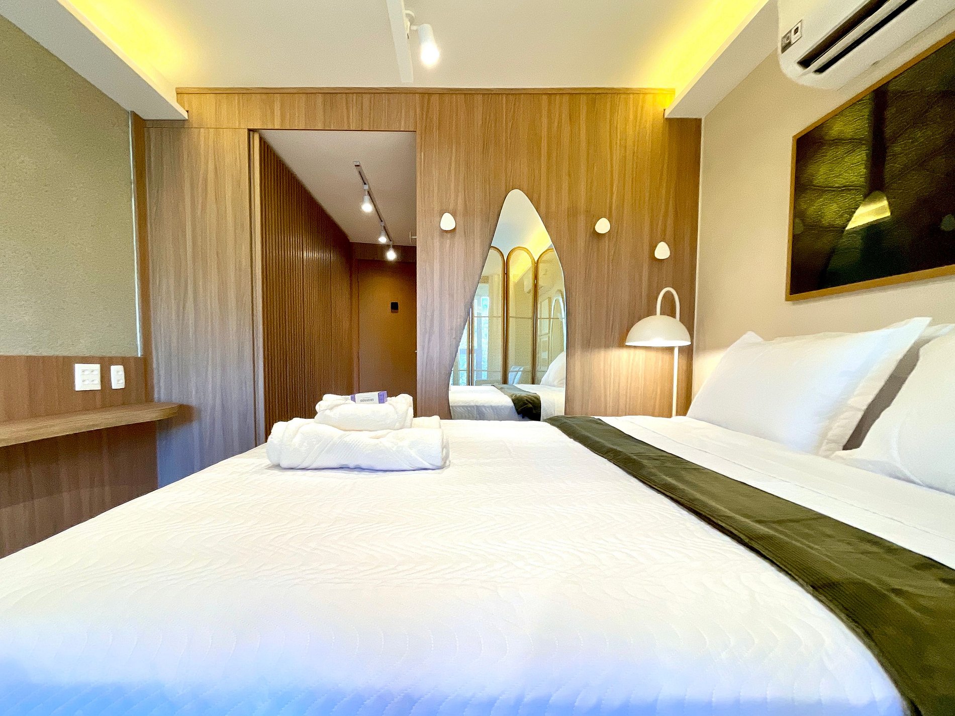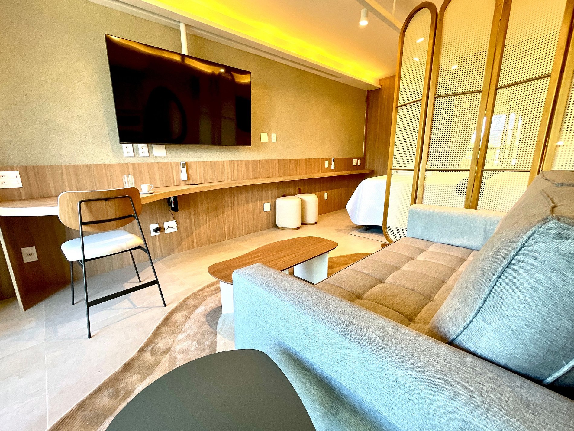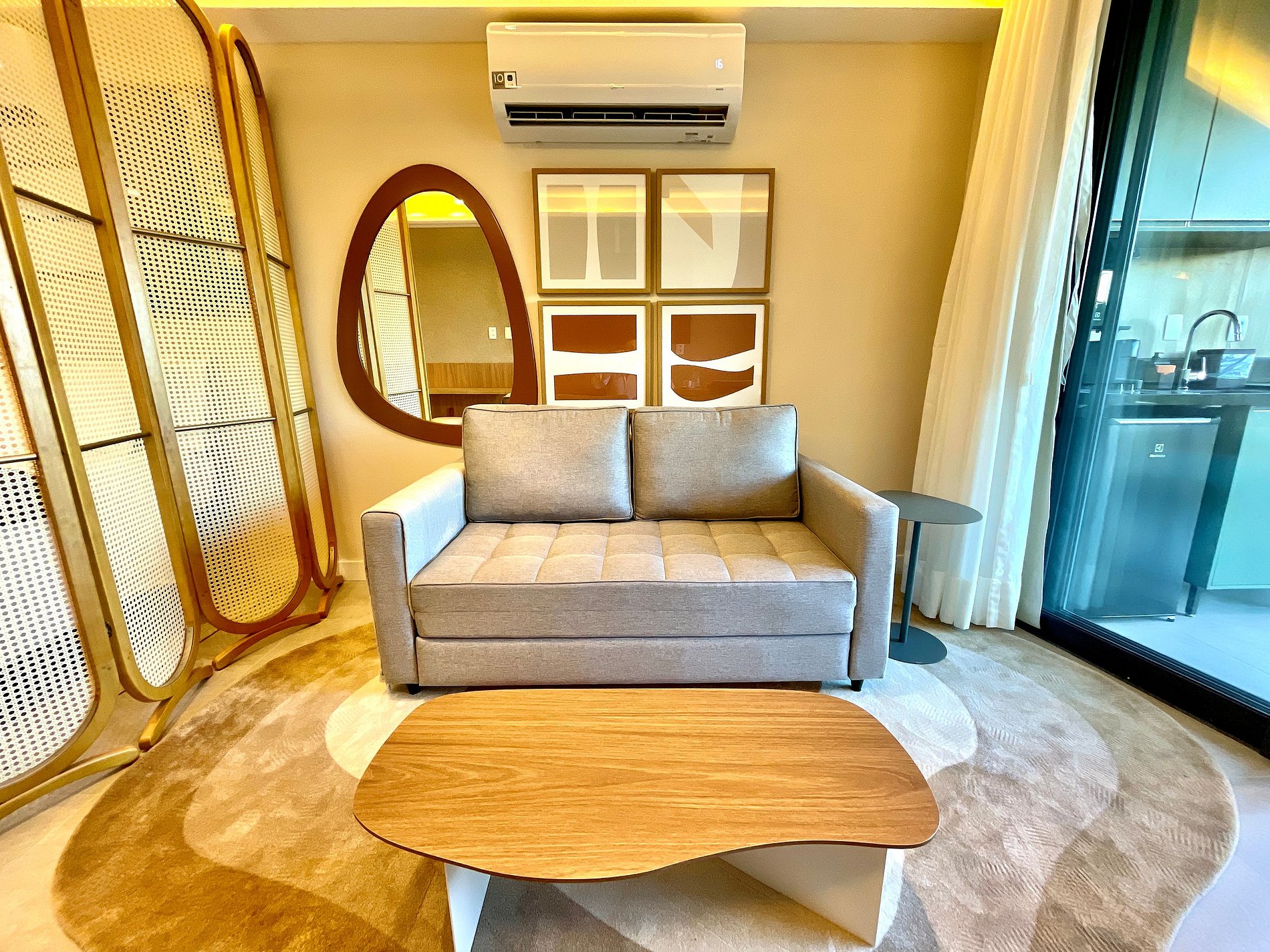 Quarto/sala super agradável com sofá cama, cama queen, armários, ar condicionado, Smart TV, cortina blackout, mesa de jantar, diversas tomadas, além de contar com uma varanda super charmosa. Internet de alta velocidade. Banheiro todo completo e com chuveiro com boa pressão. Cozinha equipada com geladeira, cooktop, forno, máquina de Nespresso, Airfryer, filtro de água e diversos utensílios. Oferece também outras comodidades, como berço portátil, secador de cabelo, tábua e ferro de passar roupa e kit de amenities (shampoo, condicionador e sabonete).