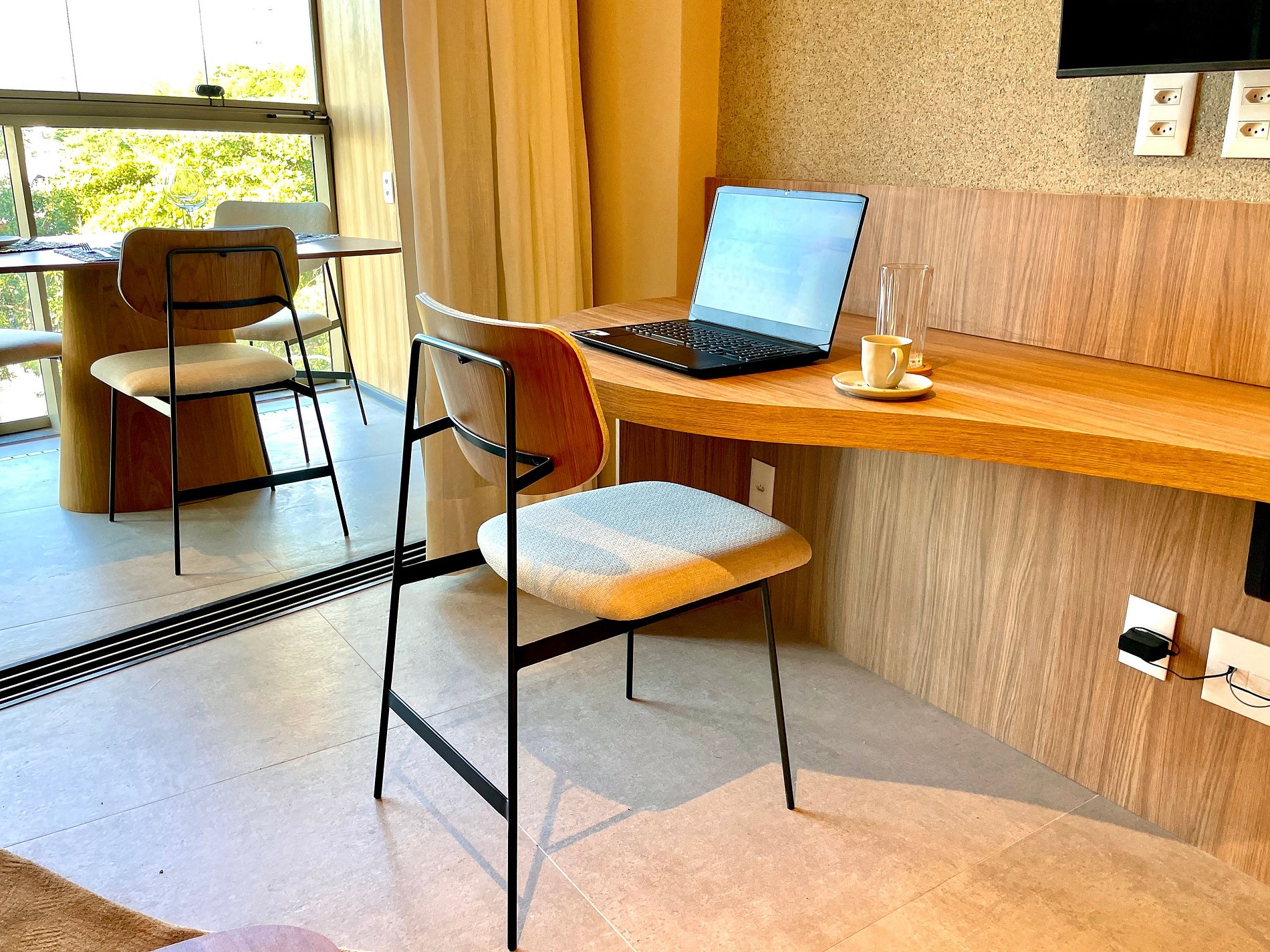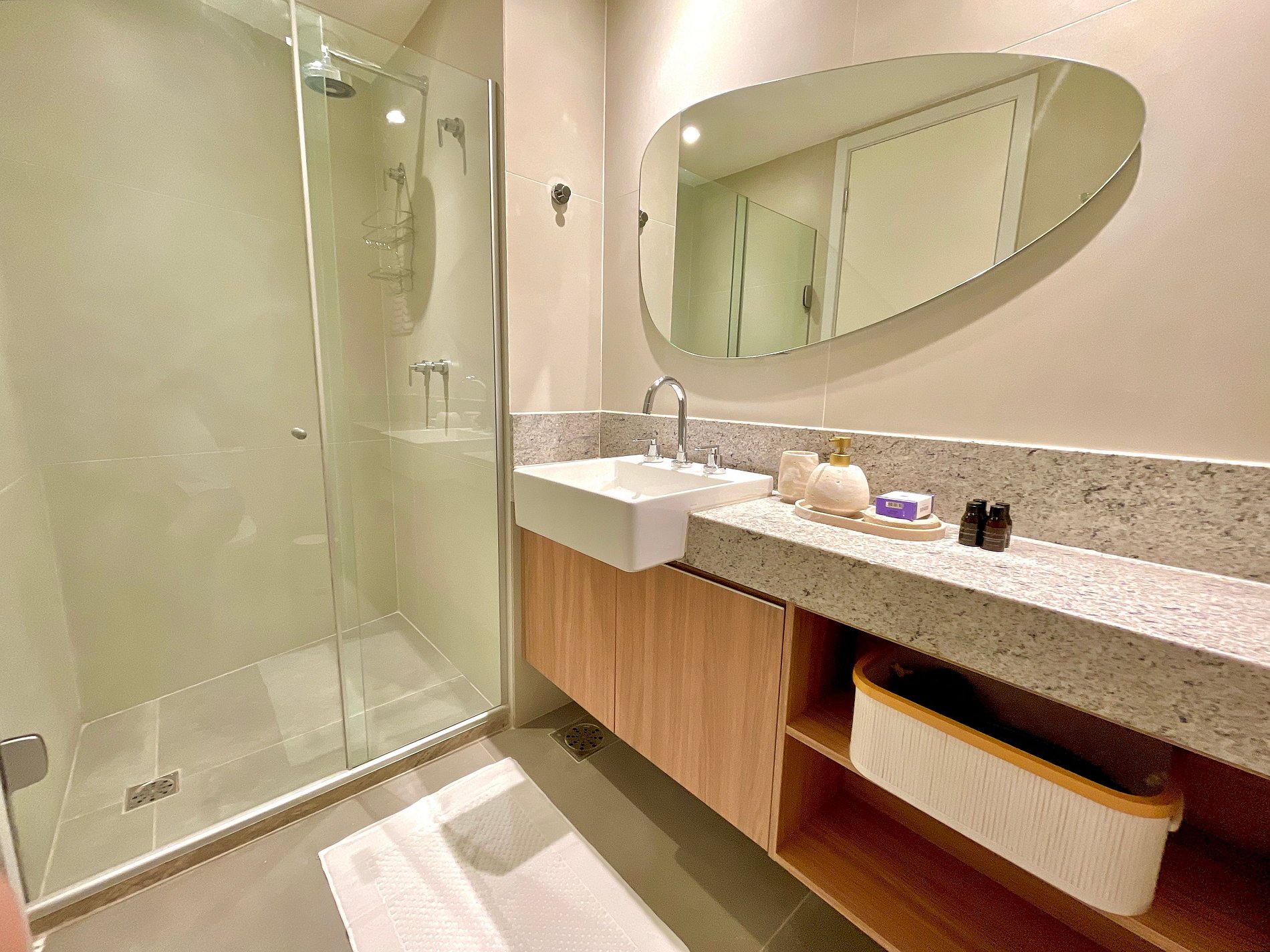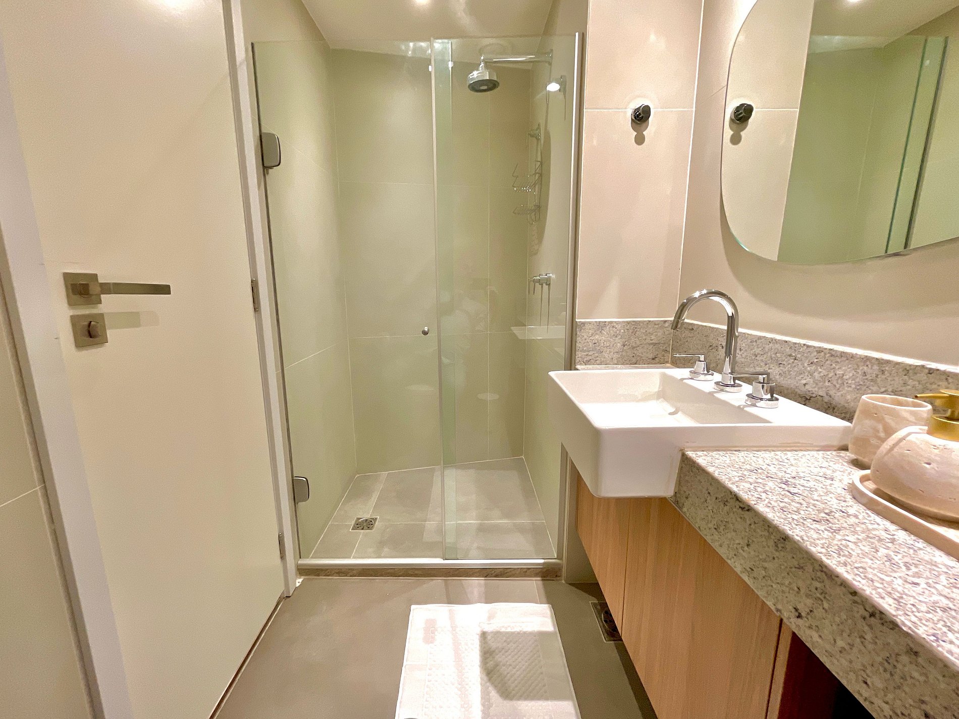 Quarto/sala super agradável com sofá cama, cama queen, armários, ar condicionado, Smart TV, cortina blackout, mesa de jantar, diversas tomadas, além de contar com uma varanda super charmosa. Internet de alta velocidade. Banheiro todo completo e com chuveiro com boa pressão. Cozinha equipada com geladeira, cooktop, forno, máquina de Nespresso, Airfryer, filtro de água e diversos utensílios. Oferece também outras comodidades, como berço portátil, secador de cabelo, tábua e ferro de passar roupa e kit de amenities (shampoo, condicionador e sabonete).
